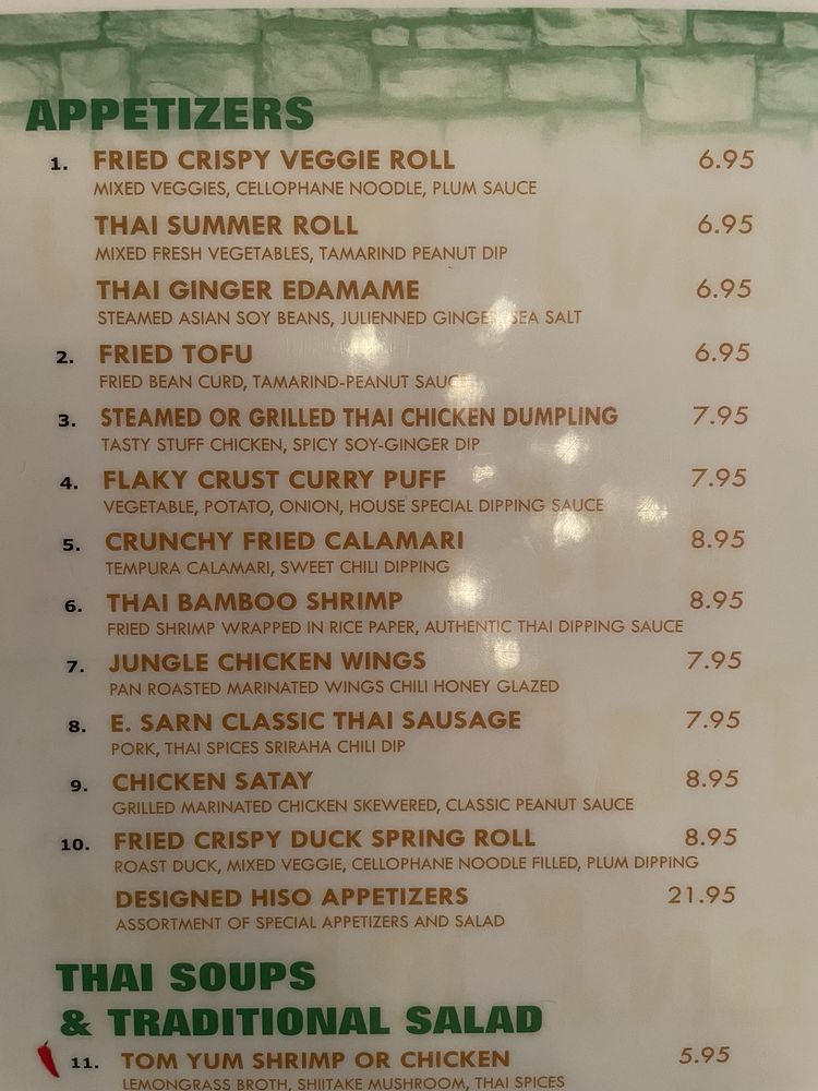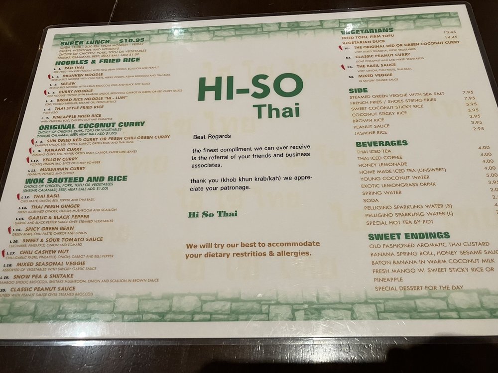 Introducing "Hi-So Thai", a Thai restaurant located in Weehawken, NJ. Known for its diverse menu offerings, Hi-So Thai provides a range of traditional Thai dishes such as Panwok Noodle & Fried Rice, Thai Soup, Traditional Salad, and Appetizers. Customers rave about the Drunken Noodles and Papaya Salad, praising their perfect preparation and quick service. The menu also features dishes like Chicken Curry Puff, Chicken Satay, and Crunchy Fried Calamari, all prepared with authentic Thai flavors. Despite limited dine-in options due to parking constraints, Hi-So Thai excels in providing excellent takeout and delivery services. With consistent quality and delicious flavors, Hi-So Thai is a hidden gem for Thai cuisine enthusiasts in the area.